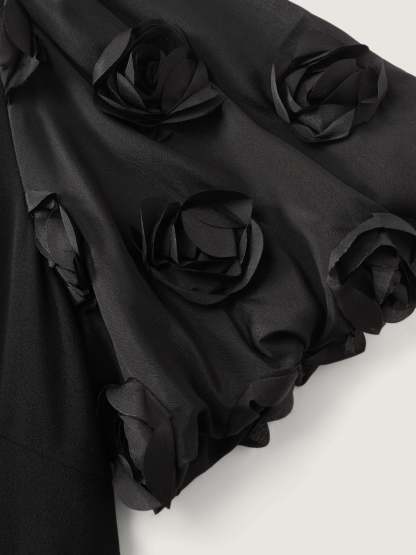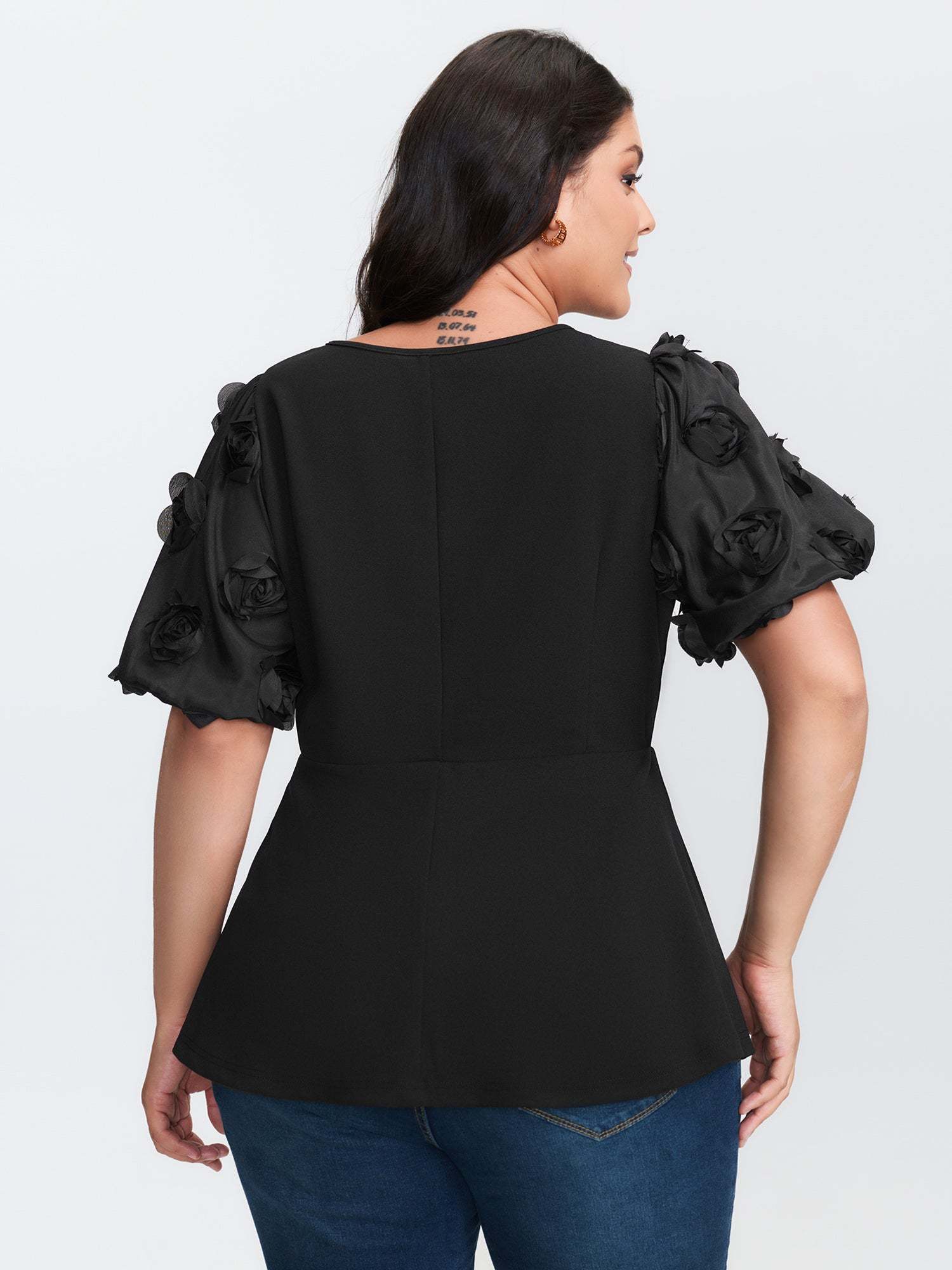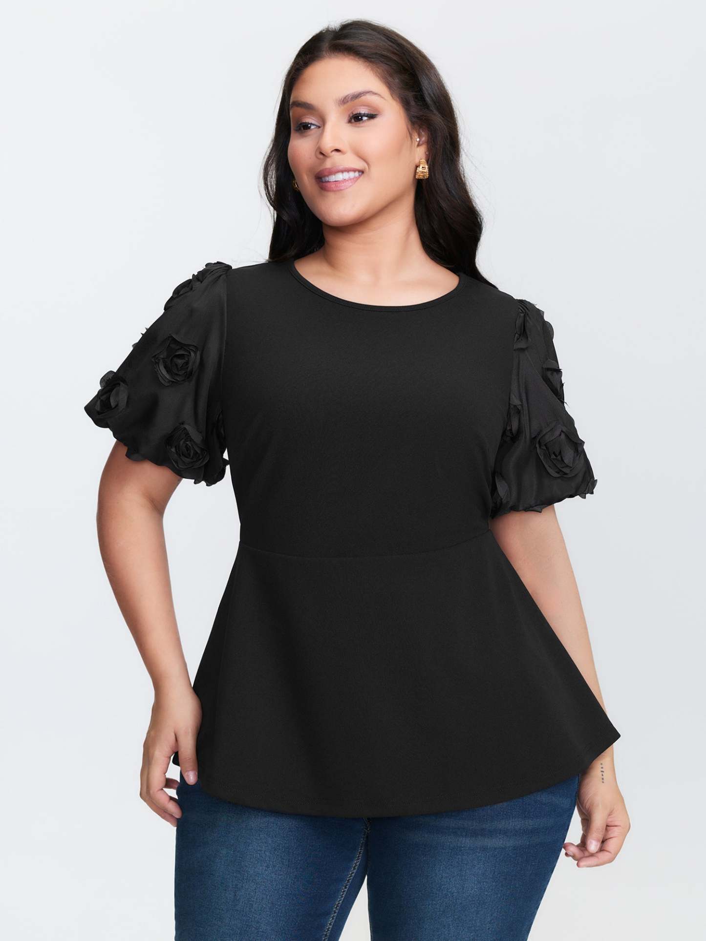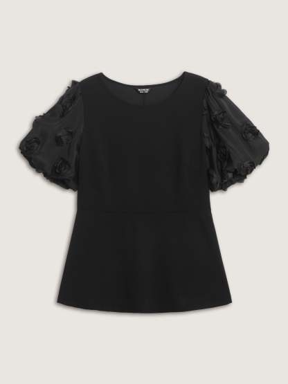 Shop 3D Textured Sleeve Cinched-Waist T-Shirt now and redefine your style with confidence at BloomChic. Tailored for mid and plus-size women. This trendy Tops Women, sizes 10-30. Color:Black;Style:Romantic;Prints:Synthetic texture;Neckline:Round Neck;Sleeve Type:Lantern Sleeve;Details:Texture, Patchwork;Pocket:No-pocket