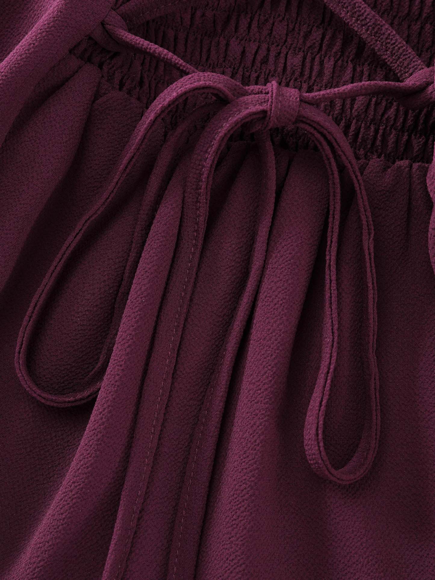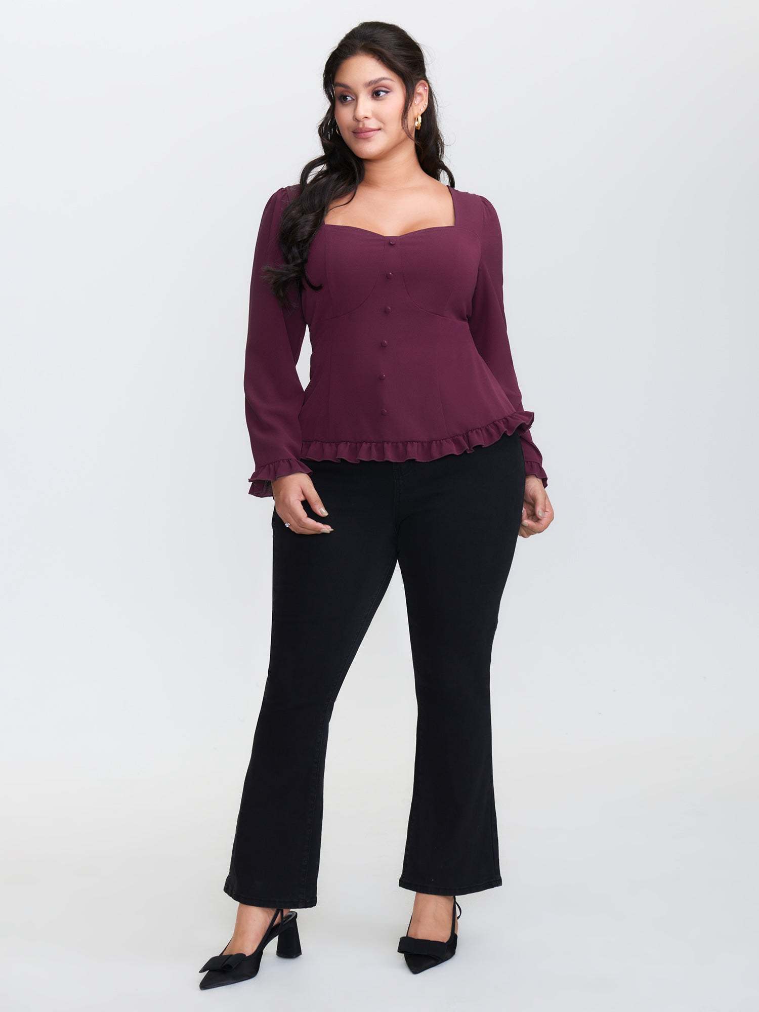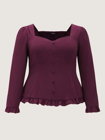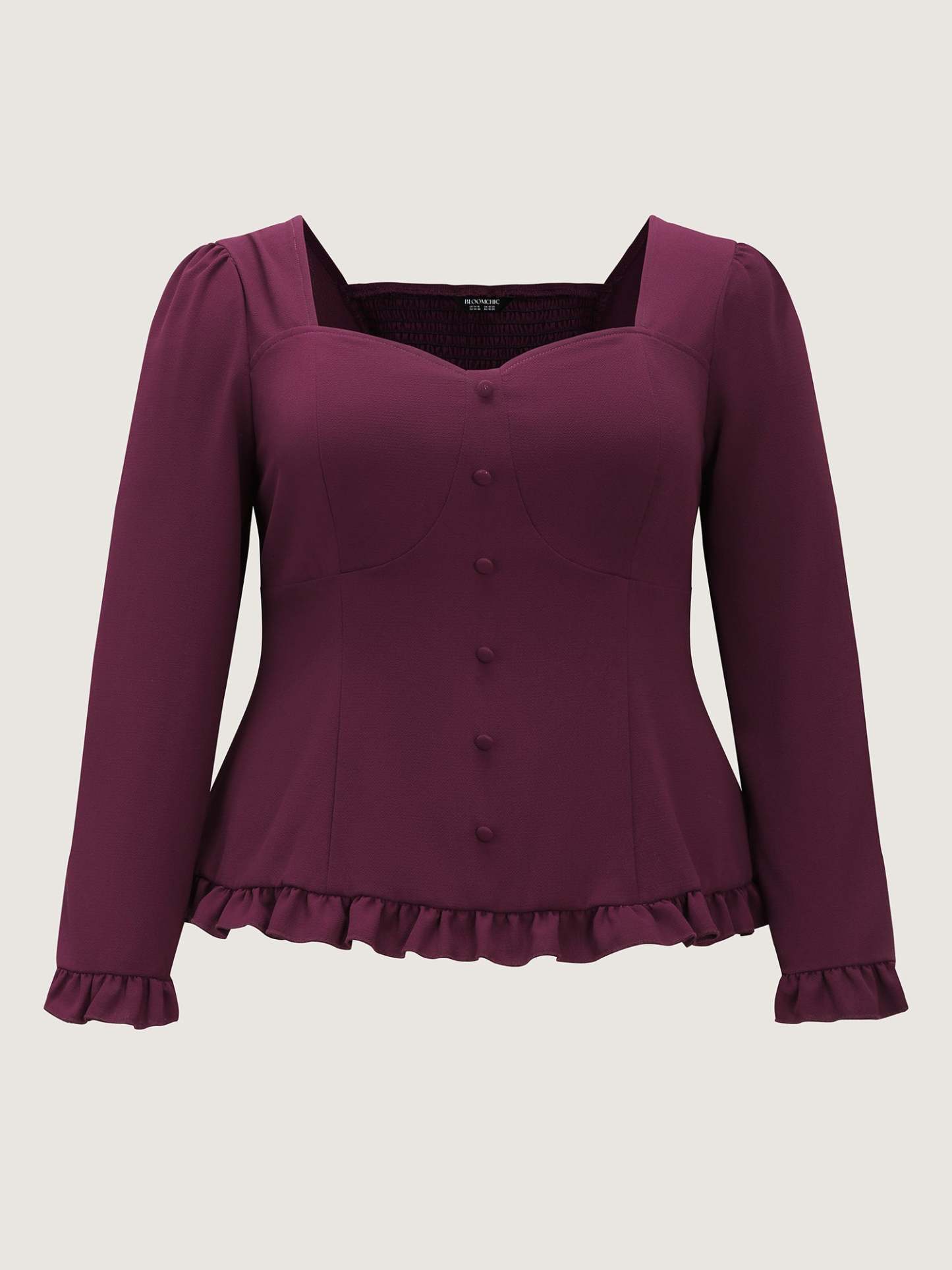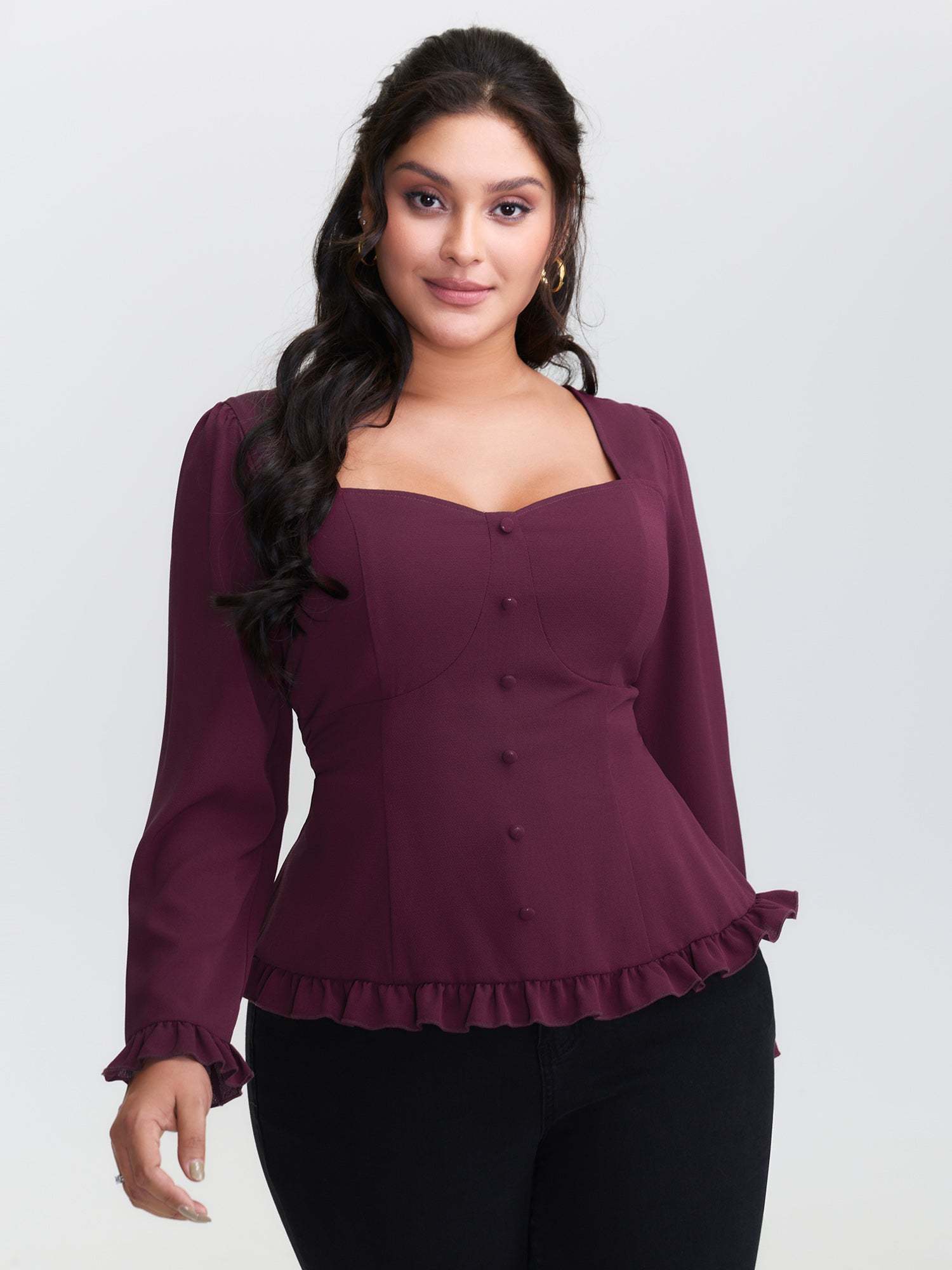 Shop Back-Tie Sweetheart Neckline Ruffled Blouse now and redefine your style with confidence at BloomChic. Tailored for mid and plus-size women. This trendy Tops Women, sizes 10-30. Color:Burgundy;Style:Timeless;Prints:Non;Neckline:Heart neckline;Sleeve Type:Lantern Sleeve;Details:Wraparound straps, Ruffles, Shirred;Pocket:No-pocket