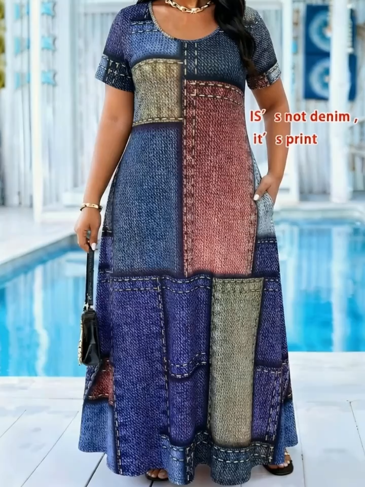 Plus Size Denim Look Patchwork Print Maxi Dress Plus Size Denim Look Patchwork Print Maxi Dress