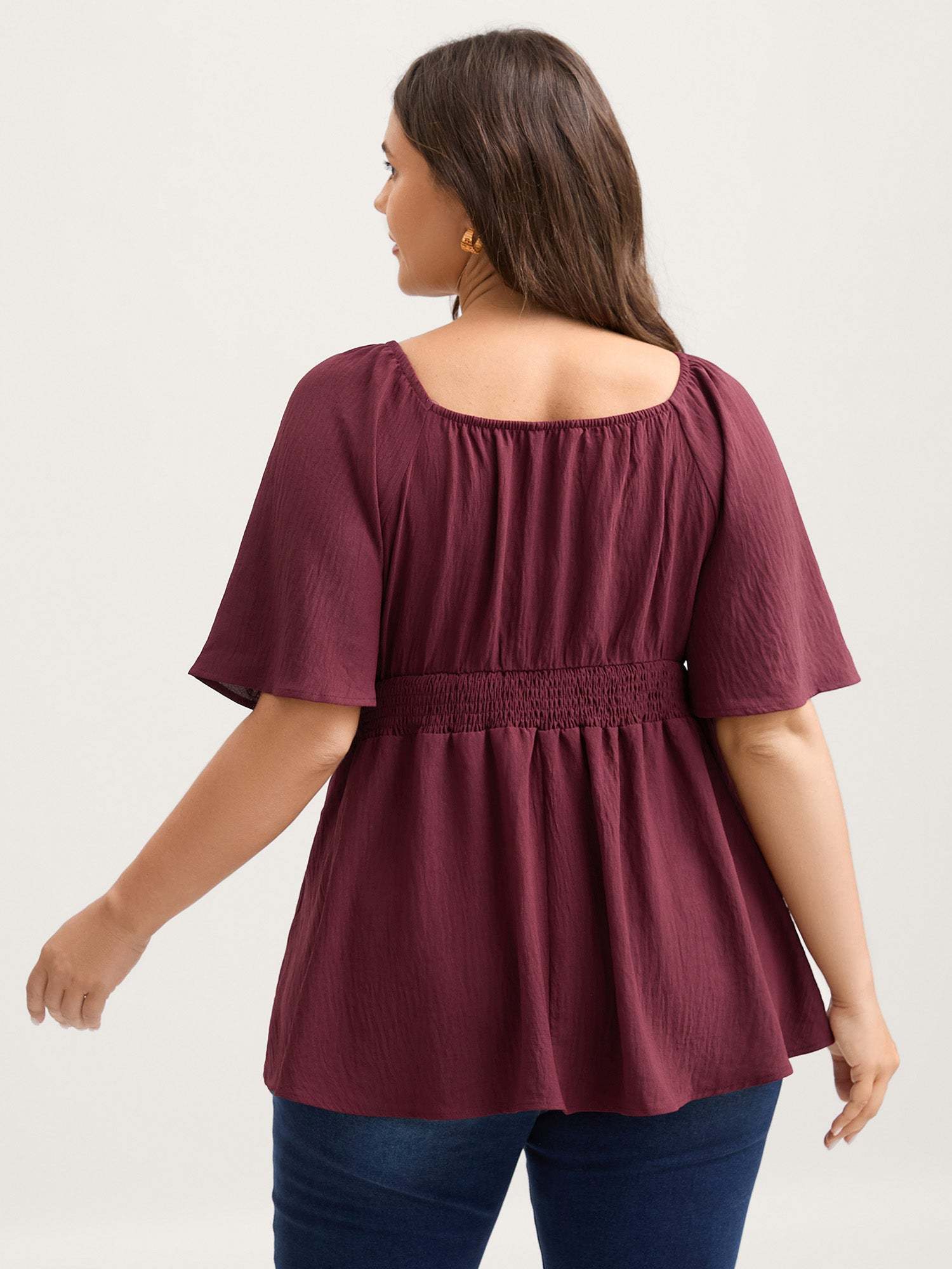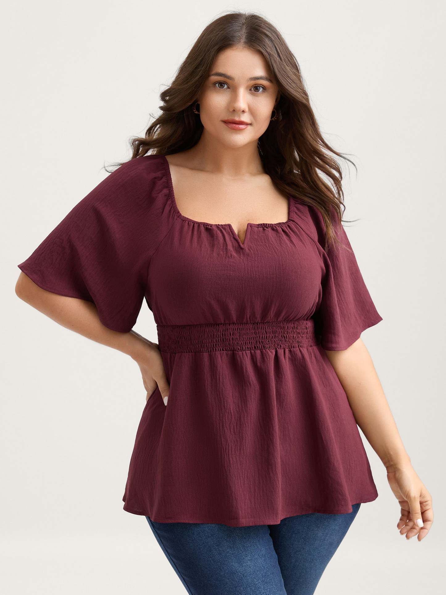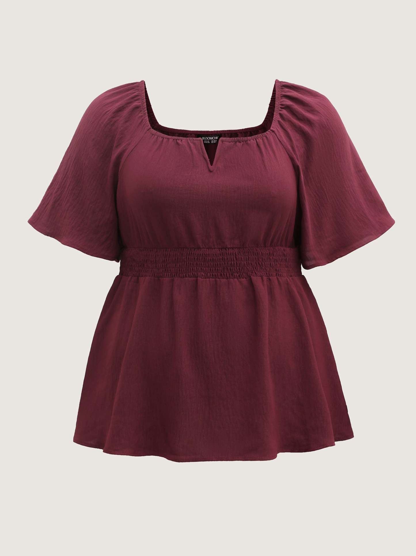 Stretchy Neckline Waist-Cinched Solid Blouse