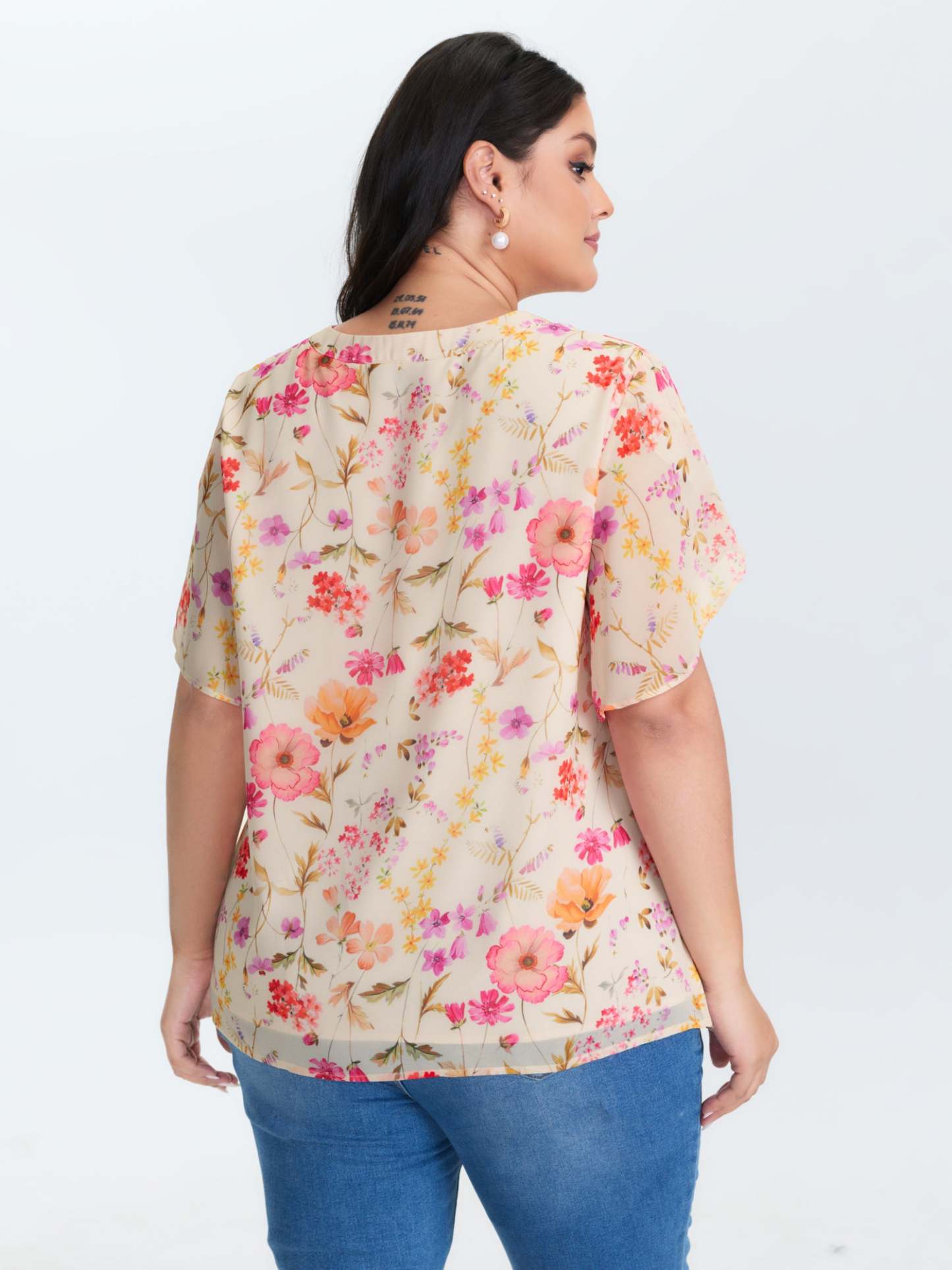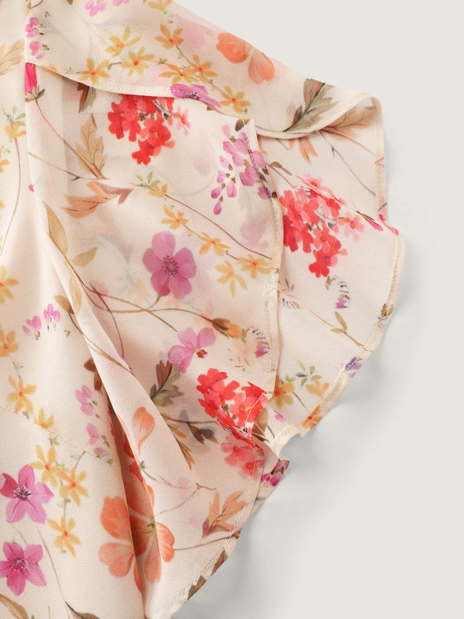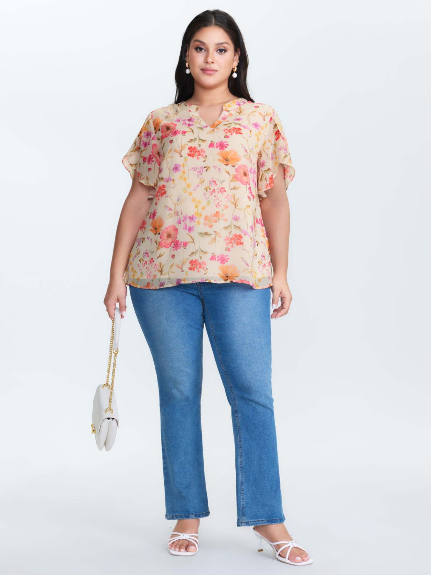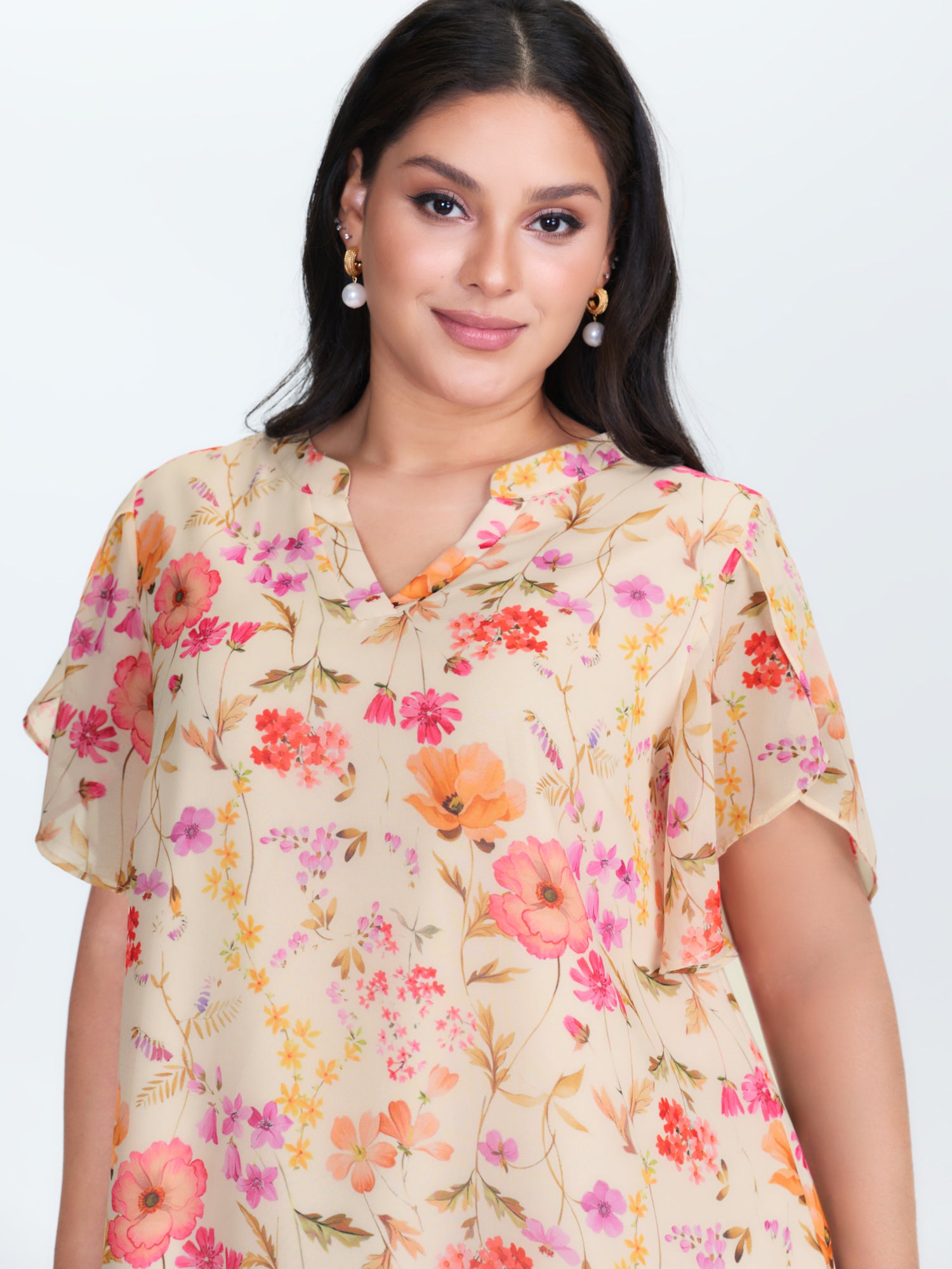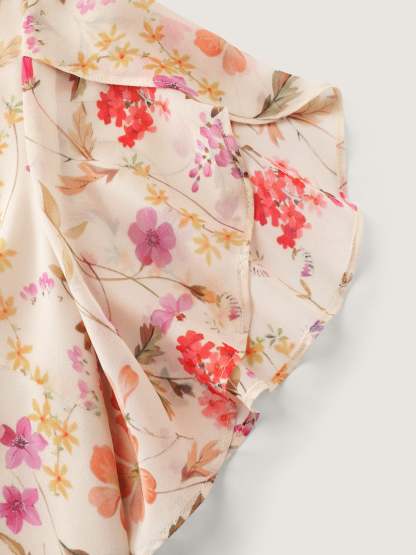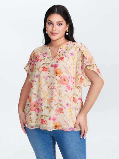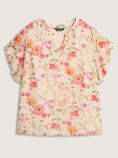 Shop Sweet Floral Print Petal Sleeve Blouse now and redefine your style with confidence at BloomChic. Tailored for mid and plus-size women. This trendy Tops Women, sizes 10-30. Color:Apricot;Style_2:Timeless;Prints:Ditsy floral;Neckline:Flat collar with V-notch;Sleeve Type:Cap sleeve;Details:See through, Gathered;Pocket:No-pocket